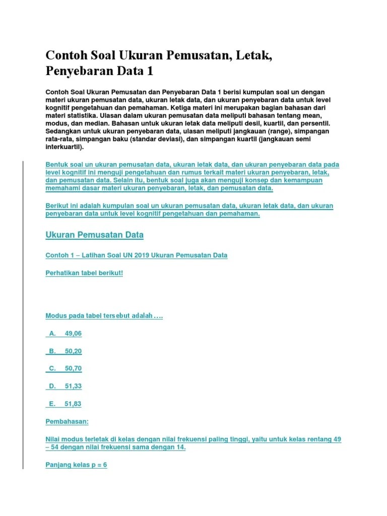 5 karyawan gaji/bln @ rp. Diskusikan soal yang ada pada modul ini bersama kelompok kalian melalui forum. Materi mean, median, modus adalah salah satu bentuk ukuran pemusatan data yang sering digunakan dalam ilmu statistika. Dalam statistika dikenal adanya ukuran pemusatan data. Berikut ini penulis sajikan soal soal beserta pembahasannya tentang statistika .